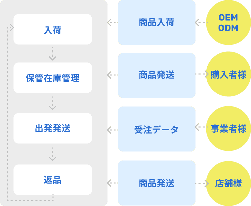 受注業務から委託OK富士ロジテックは、受注処理・入荷業務・在庫管理・流通加工・入金管理・出荷業務・返品業務・コールセンター機能を備えたフルフィルメントサービスを提供しております。サポート範囲はお客様のニーズに合わせてカスタマイズが可能です。「平日は発送代行のみ」、「土日祝日は受注処理からフルフィルメント対応」といった柔軟なアウトソーシングで、無理なく365日出荷の体制を構築できます。 ※特定のシステムを利用いただいた場合